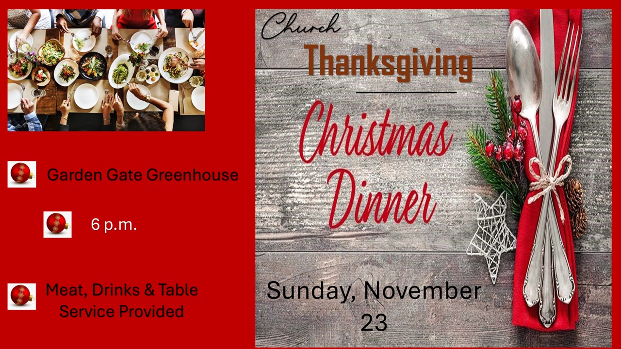 Join us for our all church dinner to celebrate Thanksgiving and Christmas together. This will take place at Garden Gate Greenhouse at 6pm. The meat, table service and drinks will be provided. Every family is asked to bring side dishes and desserts to share.